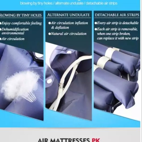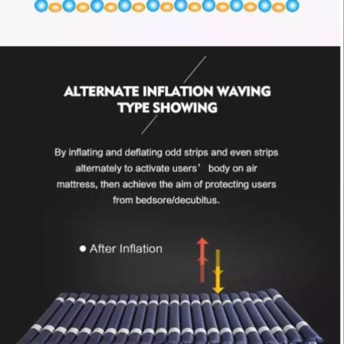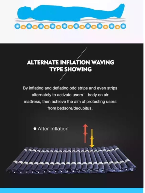 – Cắm điện liên tục, máy sẽ bơm hơi vào đệm, do dòng khí luân chuyển từ vị trí này đến vị trí khác nên đệm như 1 máy mat-xa và chống loét, ngăn ngừa loét thêm.